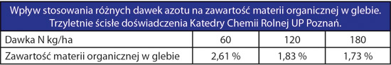 Trzyletnie badania przeprowadzone w Katedrze Chemii Rolnej i Biogeochemii Środowiska UP w Poznaniu wykazują, że zwiększanie dawek nawożenia azotem nie wpływa na wzrost zawartości materii organicznej.